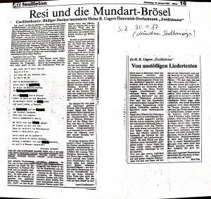 - „Resi und die Mundartbrösel“ von Ingrid Seidenfaden AZ 13.01.1987 imnd „Von anstößigen Liedern“ von Karl Ude SZ 30.01.1987